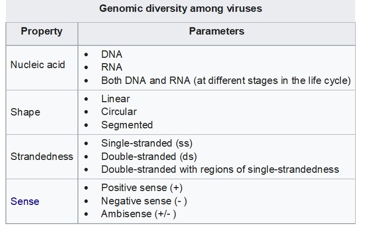 found in the 4 main properties of the genomic diversity of viruses observed,